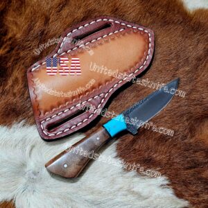 Custom handmade Damascus steel cowboy and skinner knife.overall length 8″inches.Handle Made of pine cone.also comes with leather sheath.sharp edges and still long time… I’m also take custom orders…