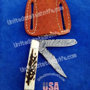 Custom Made Damascus Steel double Blades COWBOY trapper knife.