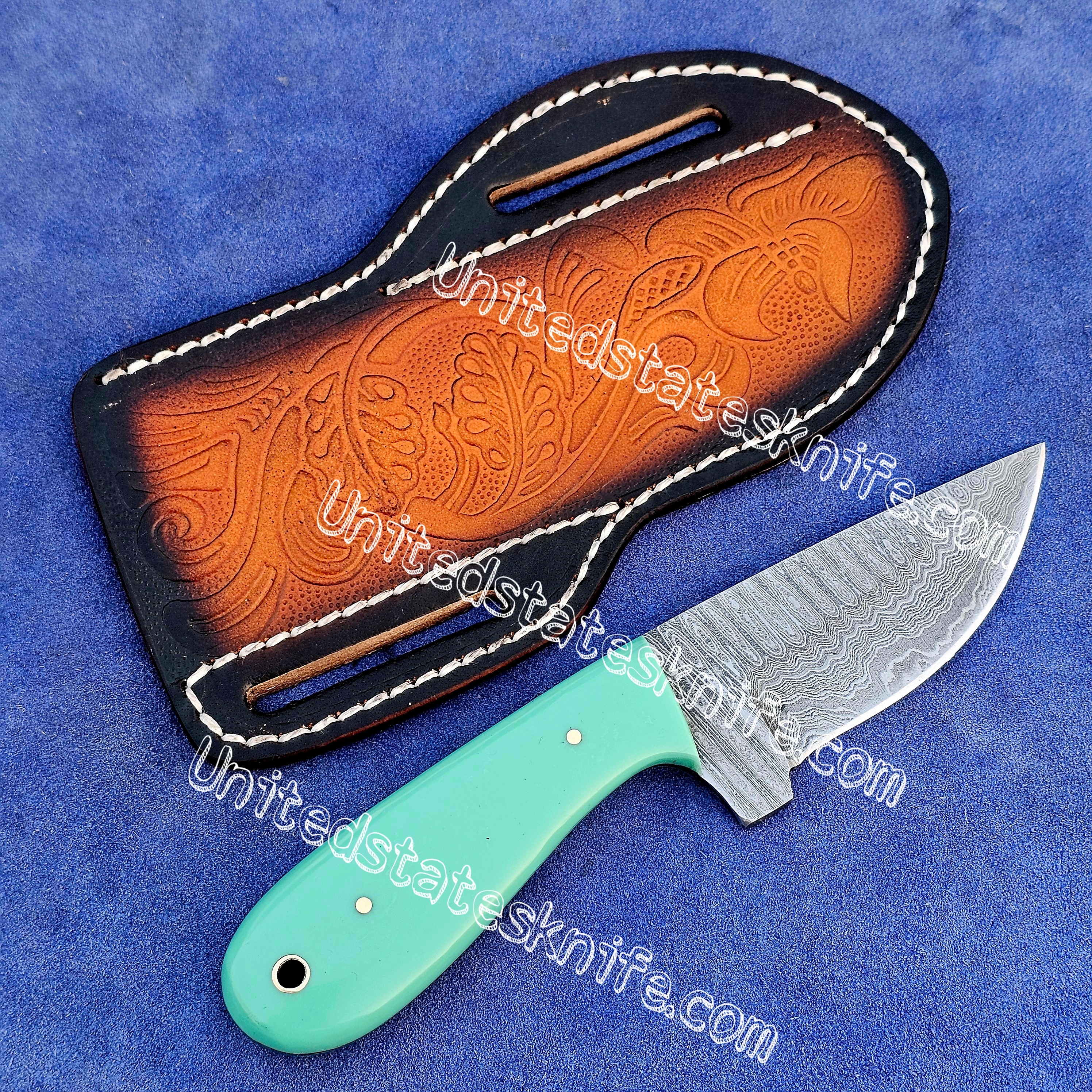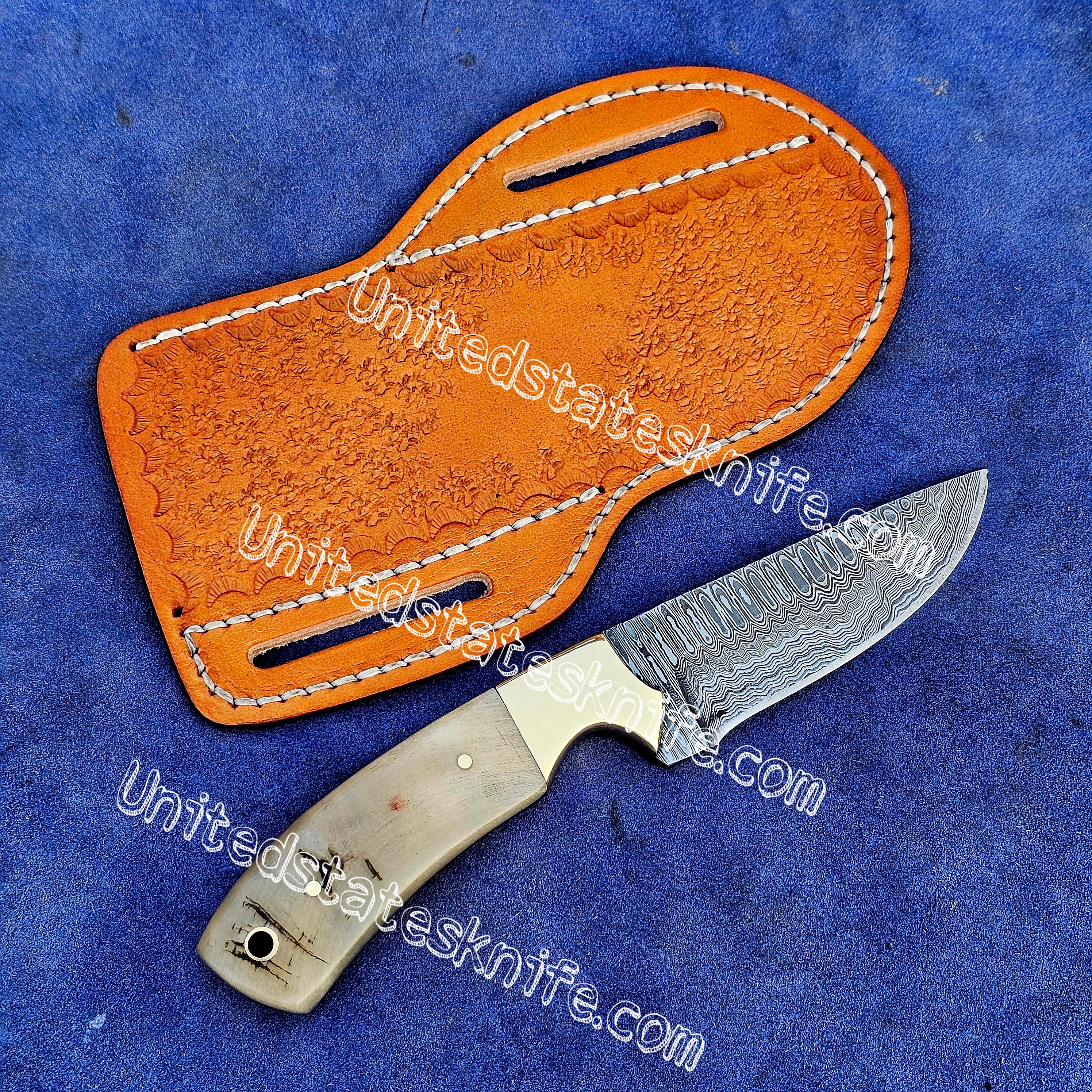 Custom Made Damascus Steel Fixed Blades cowboy and skinner knife.
