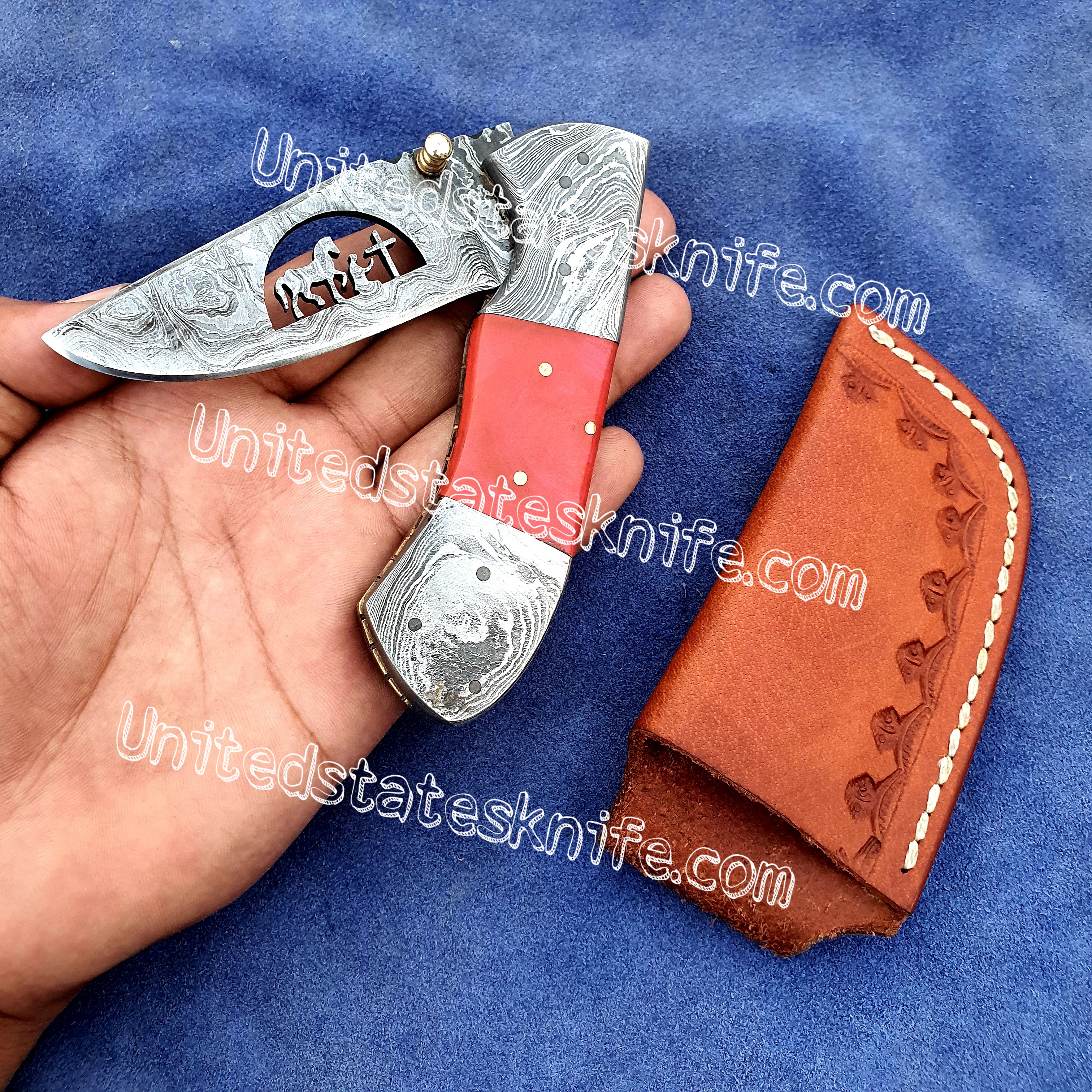 Custom made Damascus Steel cowboy praying pocket folding knife